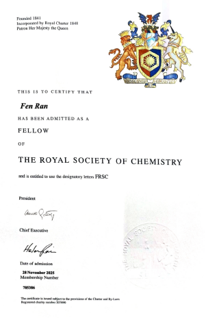 12月18日,英国皇家化学会(Royal Society of Chemistry,RSC)发来贺信,雷竞技qg冉奋教授在化学、材料和交叉领域做出卓越贡献,当选为英国皇家化学会会士(Fellow of the Royal Society of Chemistry, FRSC)。