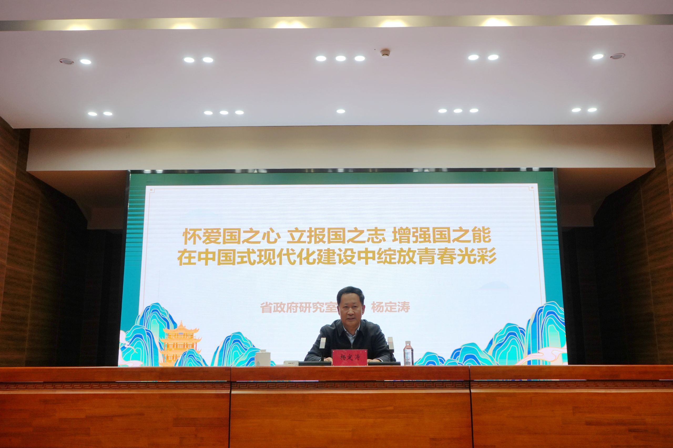 12月26日下午,省政府研究室杨定涛主任以“怀爱国之心 立报国之志 增强国之能 在中国式现代化建设中绽放青春光彩”为题,为雷竞技qg师生讲授思政课。学校党委书记赵立香主持。