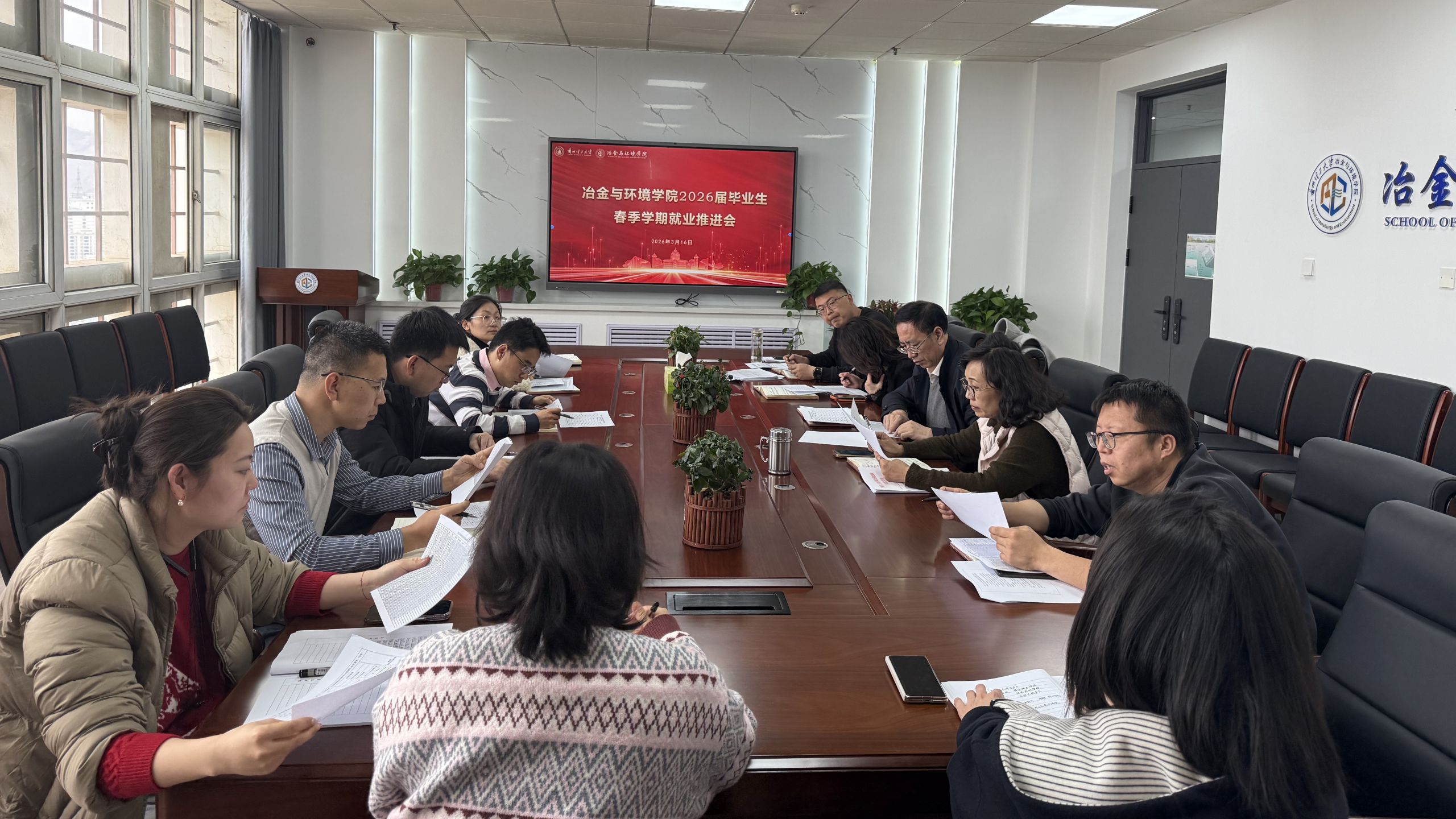 为抢抓春季就业黄金期,压实就业责任,推动2026届毕业生更充分、更高质量就业,近日,冶金与环境学院召开2026届毕业生春季学期就业推进会。会议由学院党委副书记刘文博主持,全体院领导、系主任、毕业班级班主任及辅导员参加。