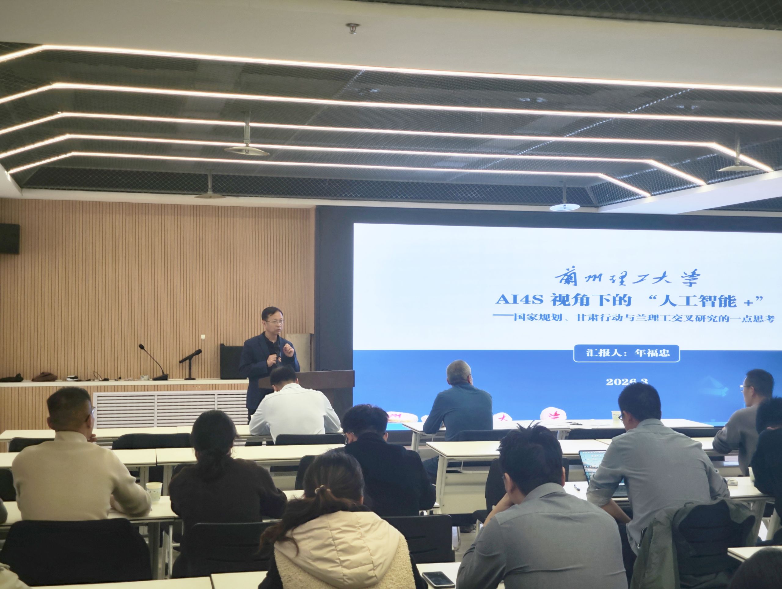 活动特邀人工智能研究院院长年福忠教授作《AI4S视角下的“人工智能+”——国家规划、甘肃行动与兰理工交叉研究的一点思考》主题报告。年福忠教授从国家战略规划与地方发展需求出发,深入探讨了人工智能赋能科学研究的路径与我校的交叉研究方向。