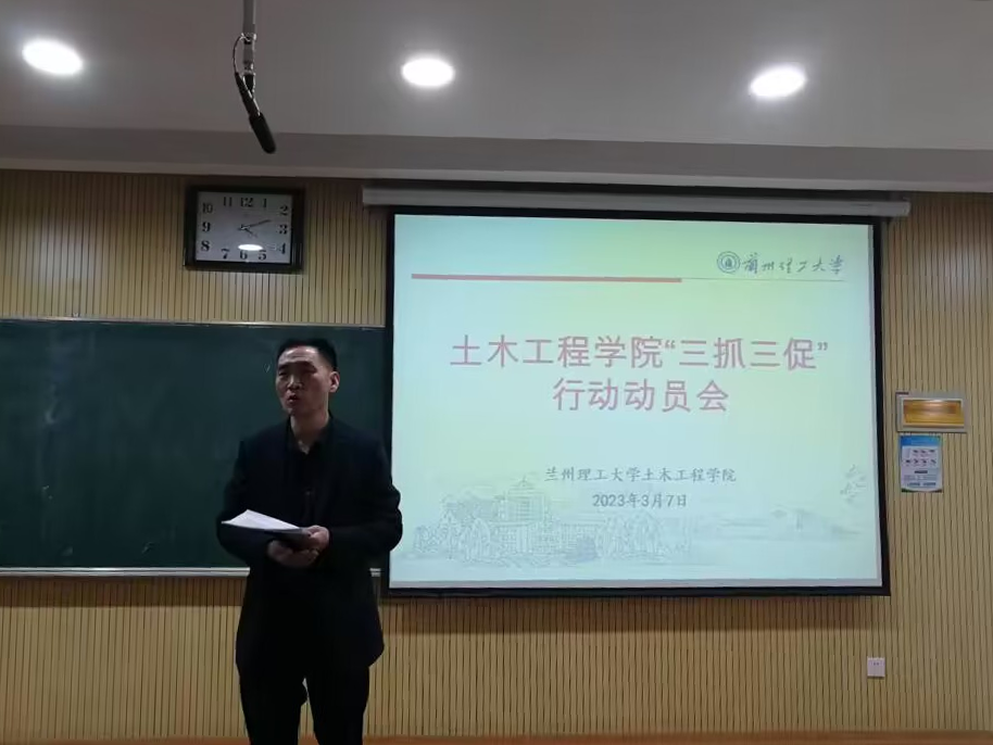 3月6日,土木工程学院“三抓三促”行动动员部署会在学院会议室召开,全体院领导、党委委员、各科室(中心)主任、各系主任、支部书记参加。3月7日,土木工程学院在兰工坪校区崇理楼201教室召开了“三抓三促”行动动员会,全院教职工参加了会议。学院党委书记陈永泰主持会议。