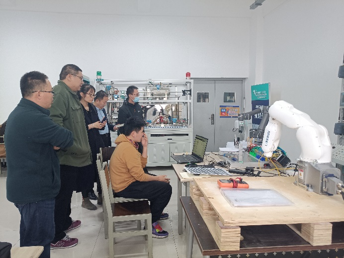 19级卓工班毕业设计学生向老师演示协作机器人控制过程