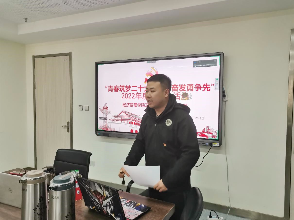 会议开始由党支部书记张凡做支部2022年度工作述职。他提到,2022年,经济管理学院工商管理本科生党支部在经济管理学院党委的正确领导下,认真学习贯彻落实党的二十大精神,全面了解学习党的二十大报告全文,紧密结合支部实际情况,通过再次深入学习党的历史,进一步坚定对共产主义的信仰,对中国特色社会主义的信念,坚定中国特色社会主义道路自信、理论自信、制度自信、文化自信,扎实推进支部政治、思想、组织、作风和纪律建设,充分发挥了党支部“战斗堡垒”作用,为各项工作圆满完成提供了坚强保证。同时,他还列举了支部存在的问题、说明整改措施、部署工作计划。