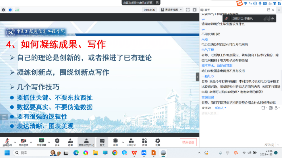 2023年4月23日晚上8.00-9.30,电气工程与信息工程学院电气工程系线上举行了2023级硕士-导师双选会。会议邀请了电气工程系2023级全体拟录取硕士、电气工程系硕士生导师、本校及外校部分大三同学。电气工程系主任张宏亮副教授首先介绍了雷竞技qg的基本情况和电信学院的发展历史,然后对电气工程学科和专业建设、雷竞技竞彩首页、实验室条件、创新创业、社会服务和成果转化、研究生报考和录取等情况进行了详细介绍,让拟录取研究生及大三准备考研学生全面了解了电信学院及电气工程系的教学条件、学科实力及发展情况。最后公布了电气工程系硕士生导师联系方式,动员2023级拟录取硕士和导师尽快完成预双选,以便于充分利用好读研前的这段时间,尽早投入到研究生阶段的学习准备中,为三年研究生求学生涯打好基础。