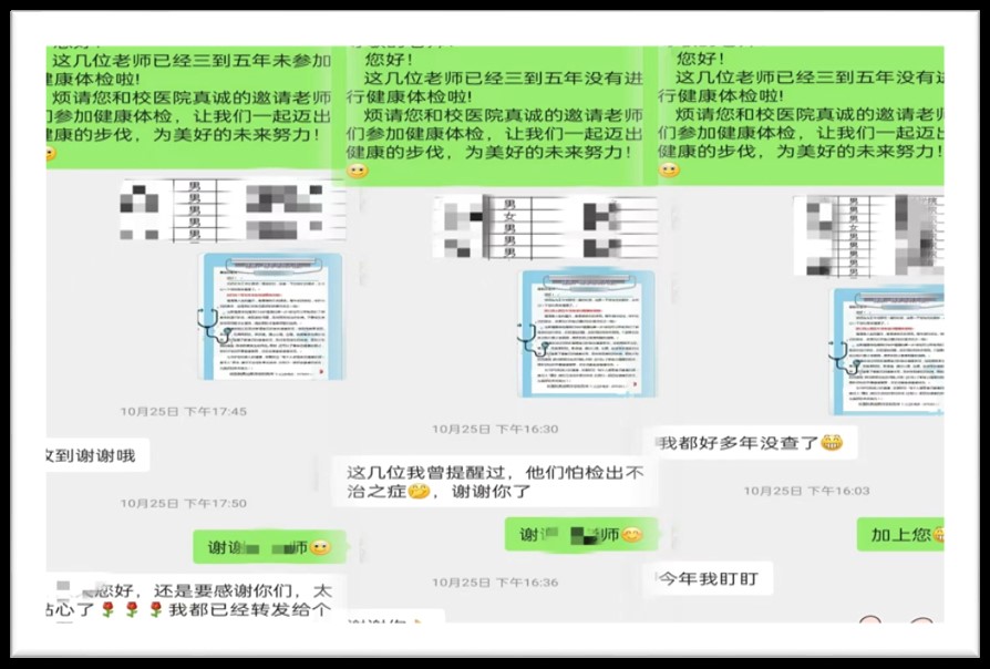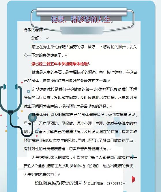 近日,校医院公卫科对连续三至五年未参加健康体检的近300名教职工发出了健康关切和温馨预警,提醒大家关爱健康,定期进行健康检测,前置疾病筛查预警,达到早预防、早诊断、早干预、早治疗目的,确保健康生活、健康工作。收到温馨提醒的教职工普遍深受感动。