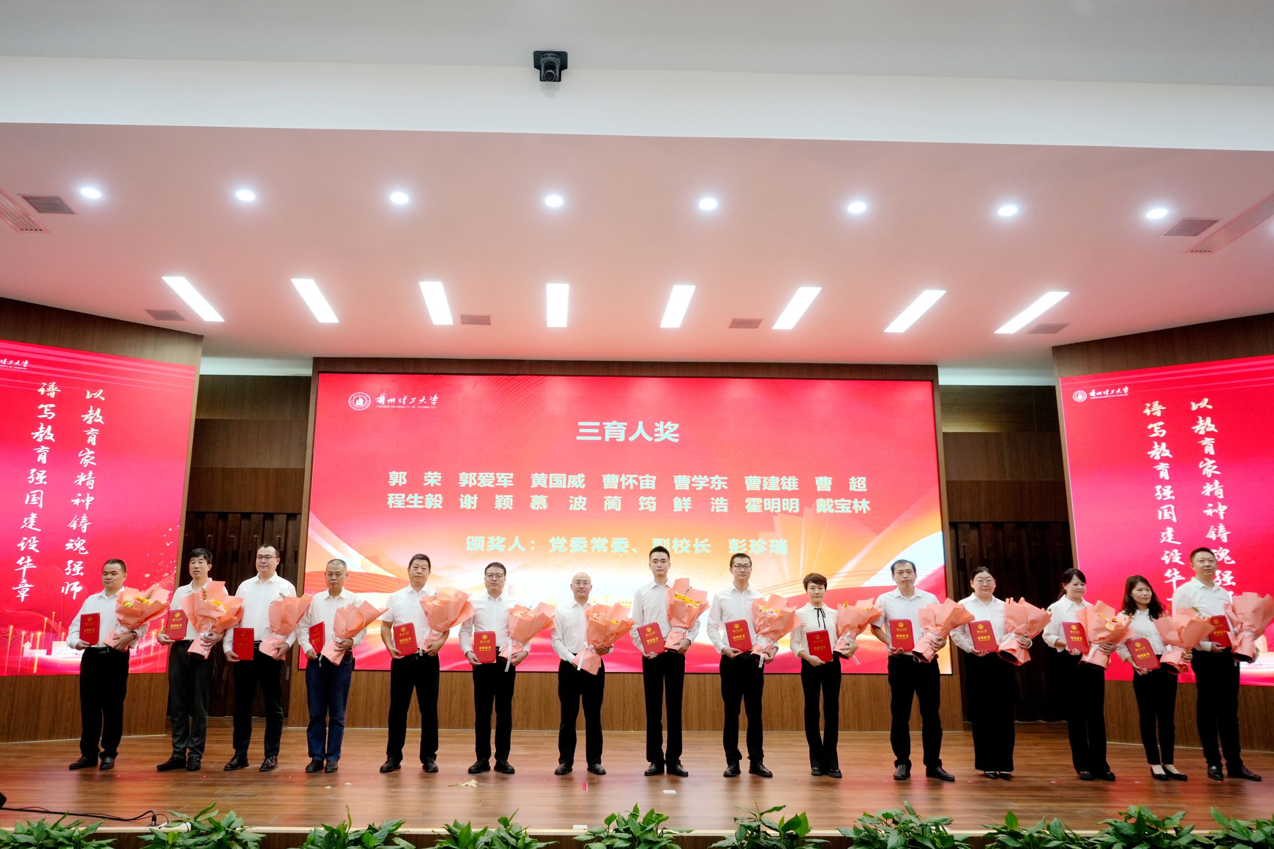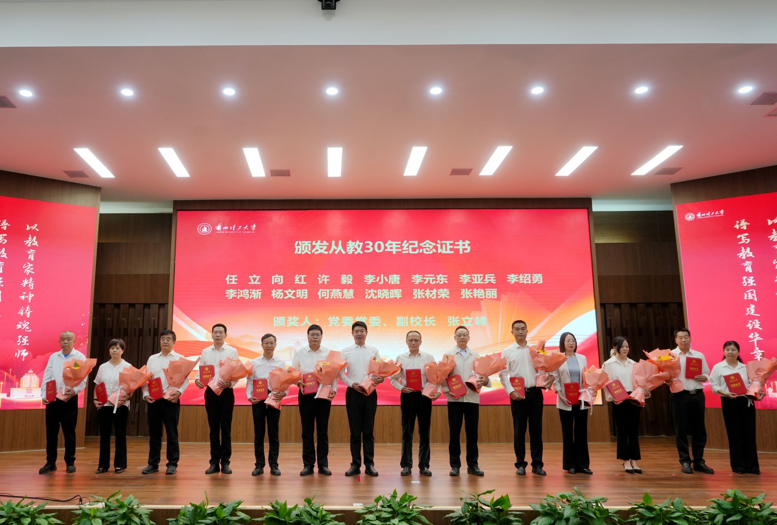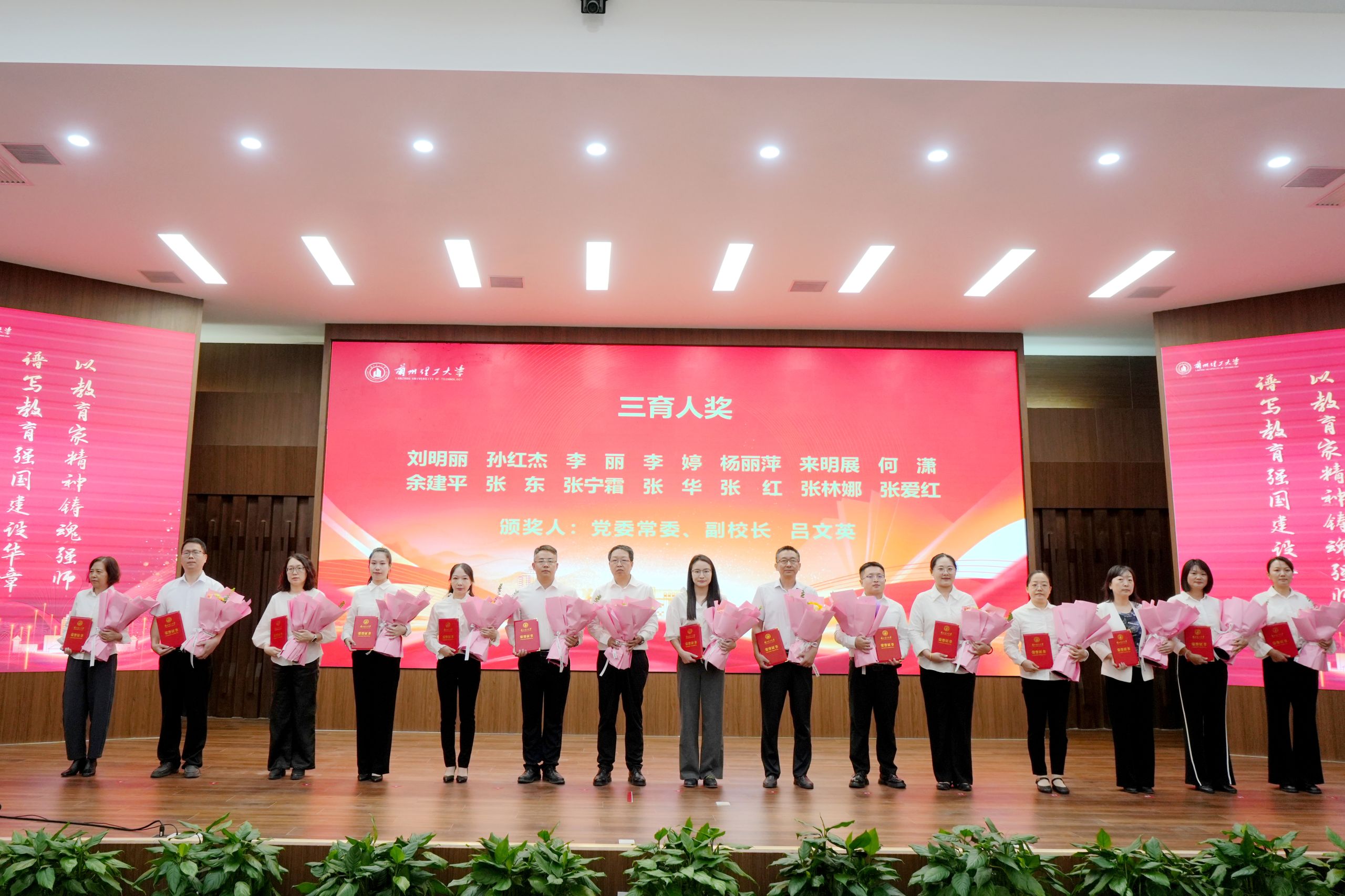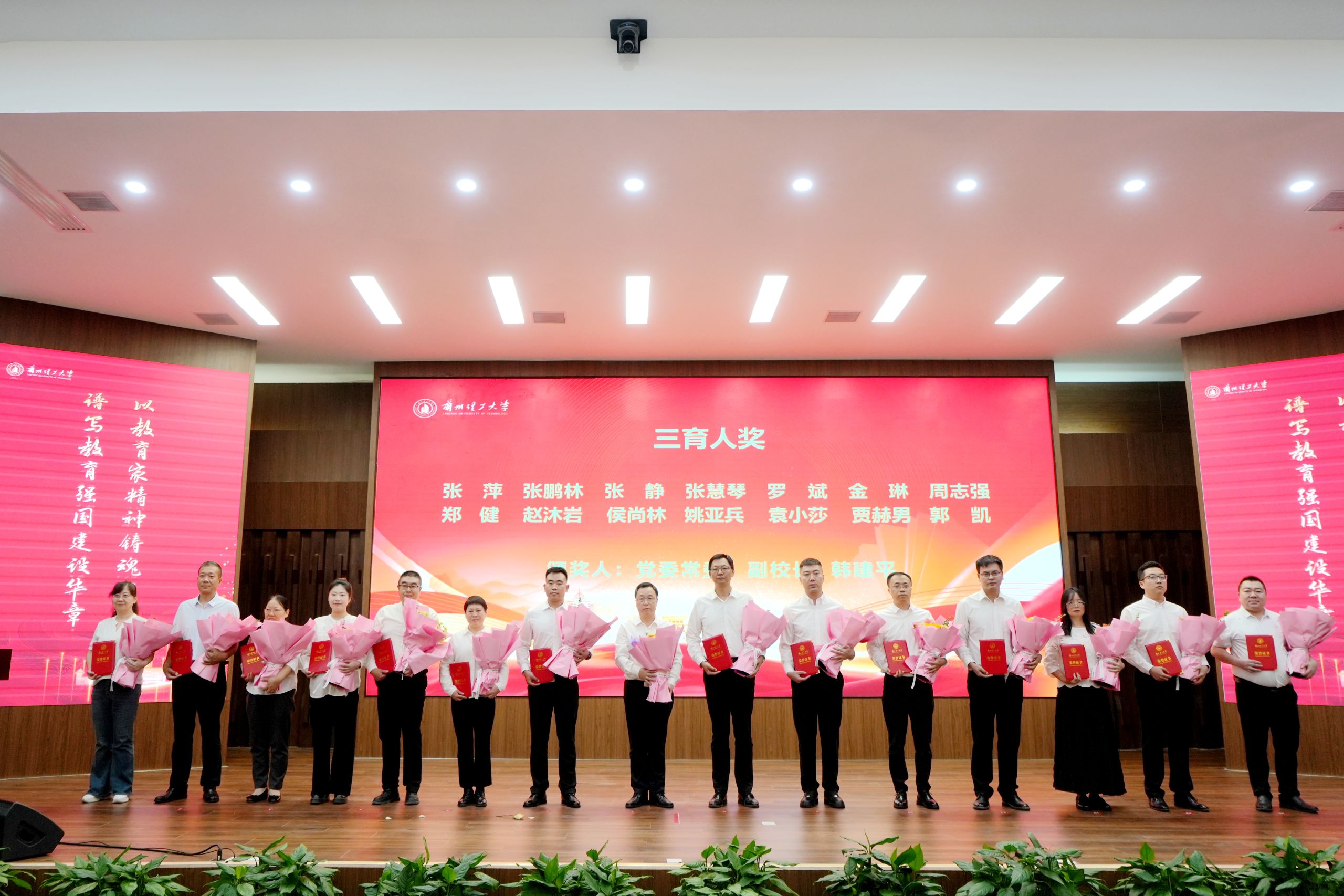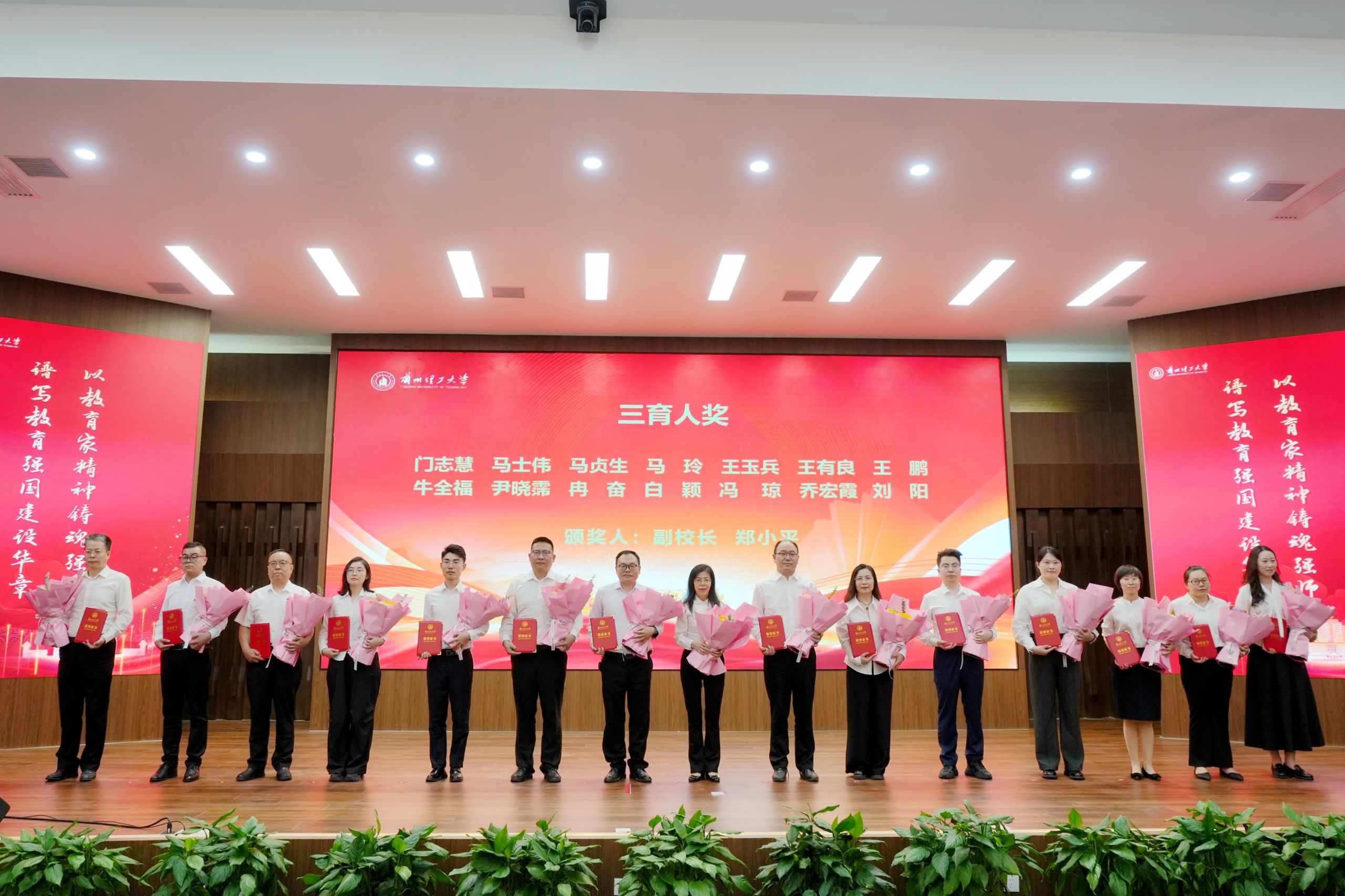 在热烈的掌声中,学校领导为获得2025年甘肃省先进工作者等各项荣誉的个人颁奖,学生代表为获奖教师献上了鲜花。