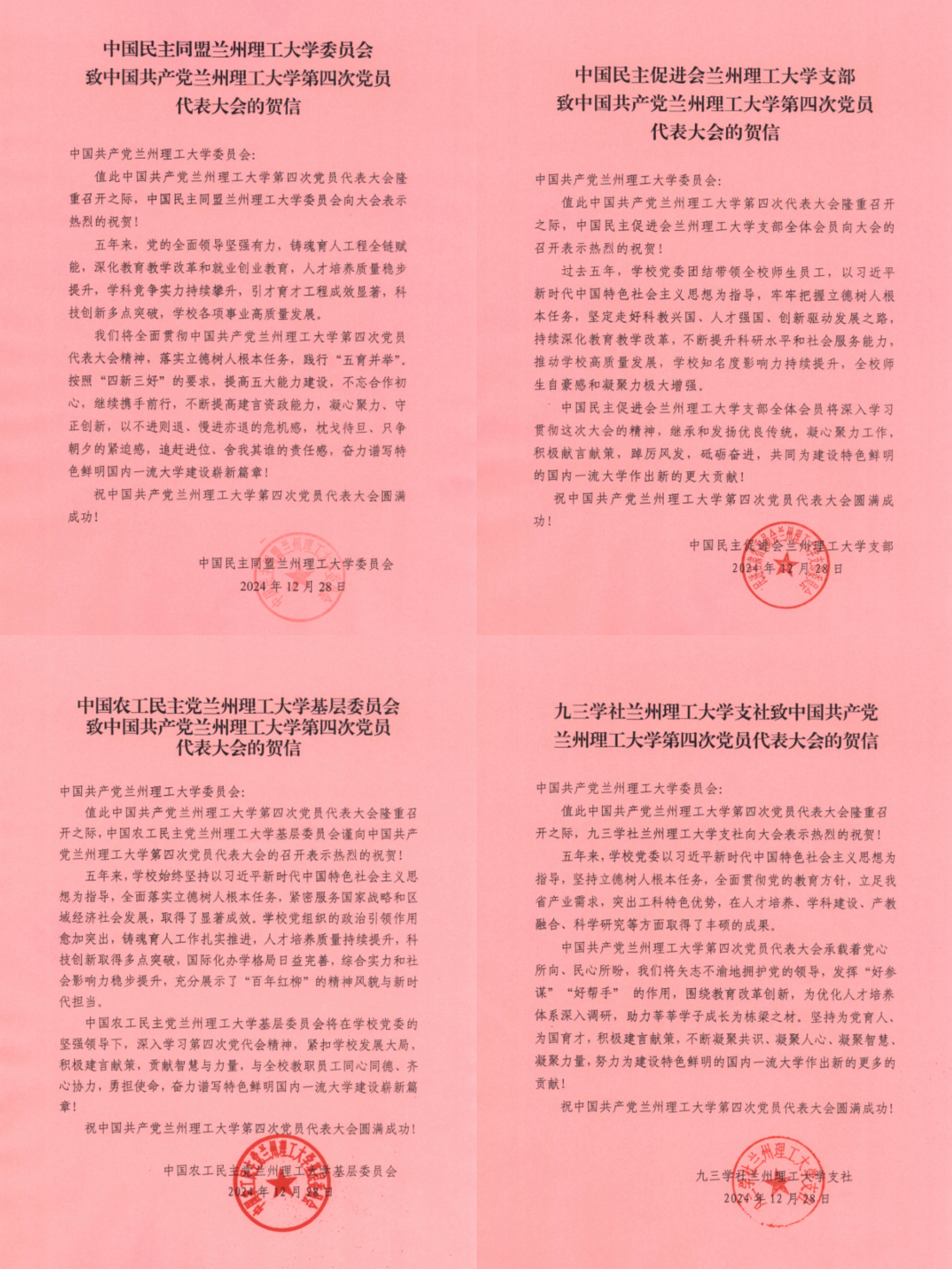 在中国共产党兰州理工大学第四次党员代表大会胜利召开之际,中国民主同盟兰州理工大学委员会、中国民主促进会兰州理工大学支部、中国农工民主党兰州理工大学基层委员会、九三学社兰州理工大学支社发来贺信向大会表示热烈的祝贺!