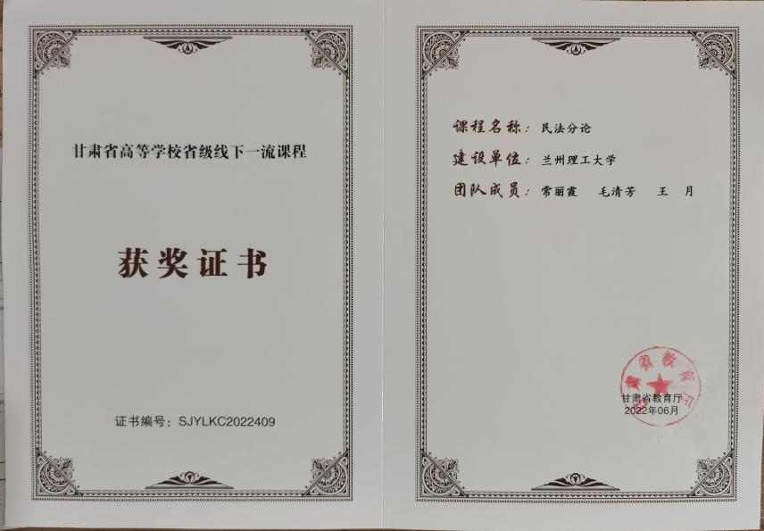 抓教研教改,3项成果实现学院独立运行以来的零突破:《民法分论》课程入选省级一流课程;《宪法学》课程获得省级课程思政示范项目;1项成果获得学校教育教学成果二等奖,并获甘肃省教育教学成果培育项目立项。